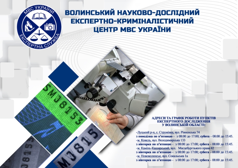 Фахівцями Волинського НДЕКЦ МВС у пунктах експертних досліджень, що розташовані у територіальних органах з надання сервісних послуг МВС в області, надаються наступні послуги: