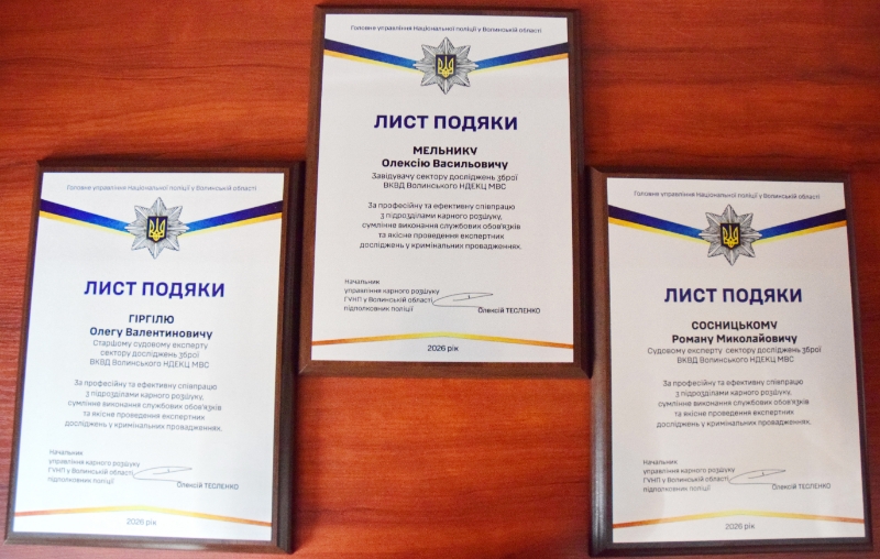 09.01.2026 за професійну та ефективну співпрацю з підрозділами карного розшуку, сумлінне виконання службових обов’язків та якісне проведення експертних досліджень у кримінальних провадженнях відзначено подяками Управління карного розшуку ГУНП у Волинській області судових експертів сектору досліджень зброї відділу криміналістичних видів досліджень Волинського НДЕКЦ МВС, а саме: Мельника Олексія, завідувача сектору, Гіргіля Олега, старшого судового експерта та Сосницького Романа, судового експерта цього сектору.